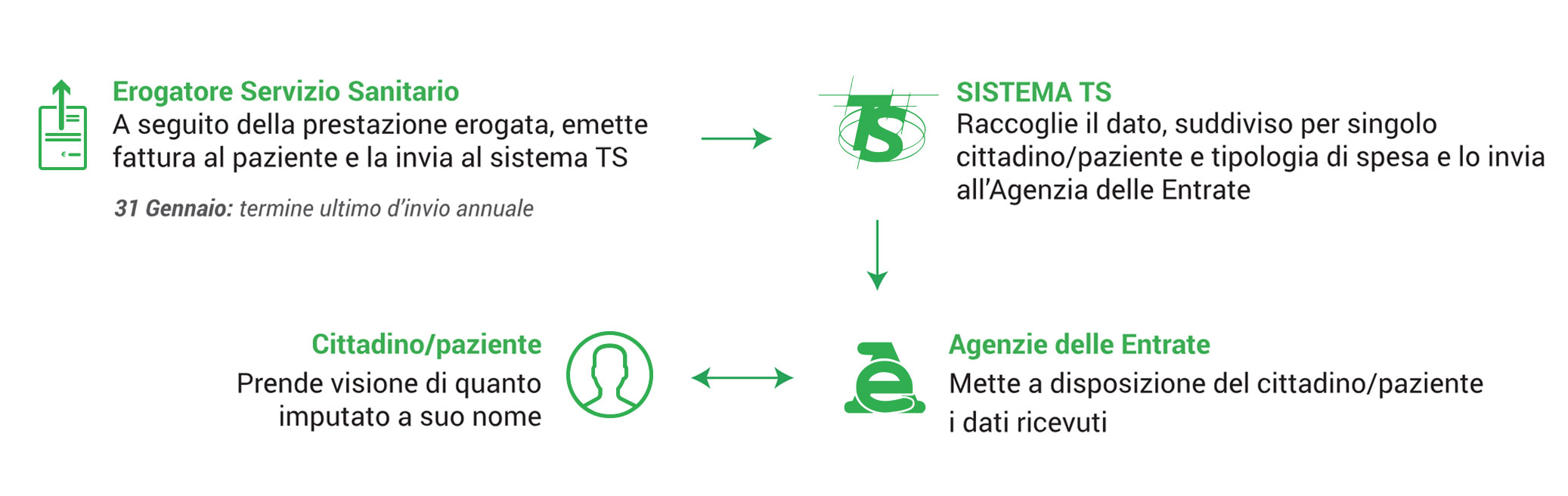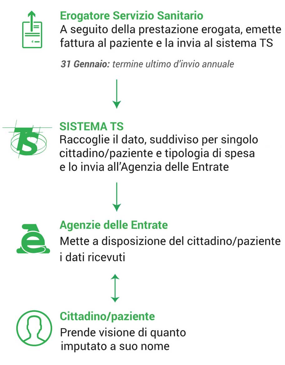 Sin dal 2006, infatti, tutti i professionisti e le strutture che erogano prestazioni sanitarie, sono obbligati all’invio al sistema TS delle fatture emesse nei confronti dei propri pazienti al fine di mettere a disposizione dell’Agenzia delle Entrate le spese sanitarie di ciascun cittadino, da dedurre nel 730.