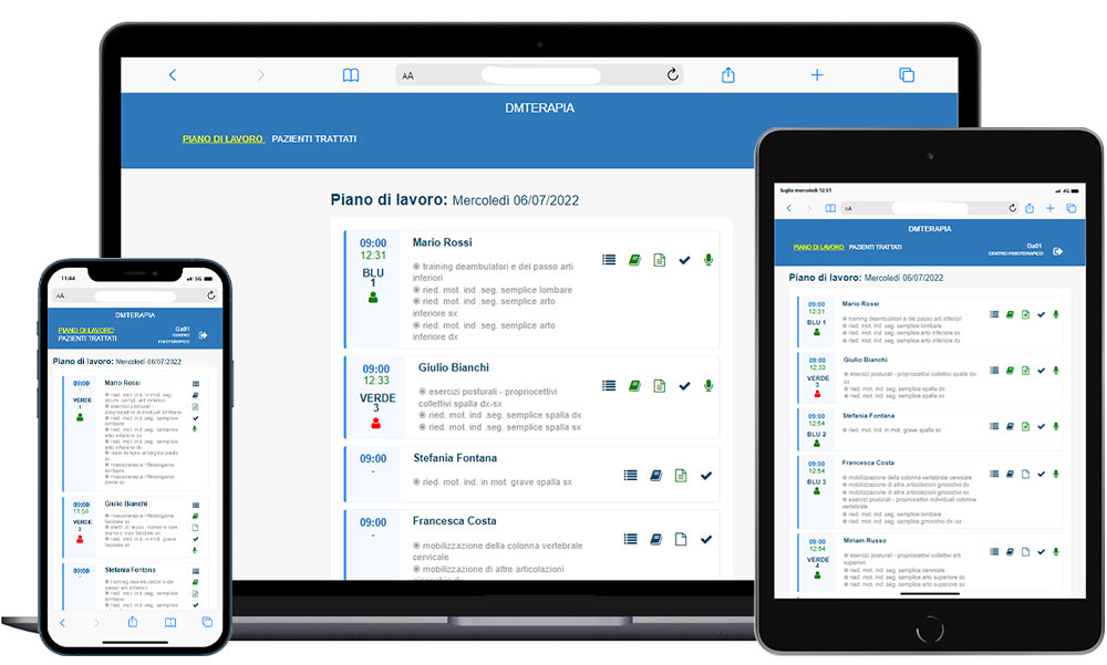 DMTERAPIA è la webapp integrata con il software per fisioterapisti DMFISIO con cui controllare, gestire e ottimizzare ogni fase del processo di erogazione delle prestazioni di fisiokinesiterapia e supportare in modo coordinato ed efficiente il lavoro dei fisioterapisti, sia in ambulatorio che a domicilio.
